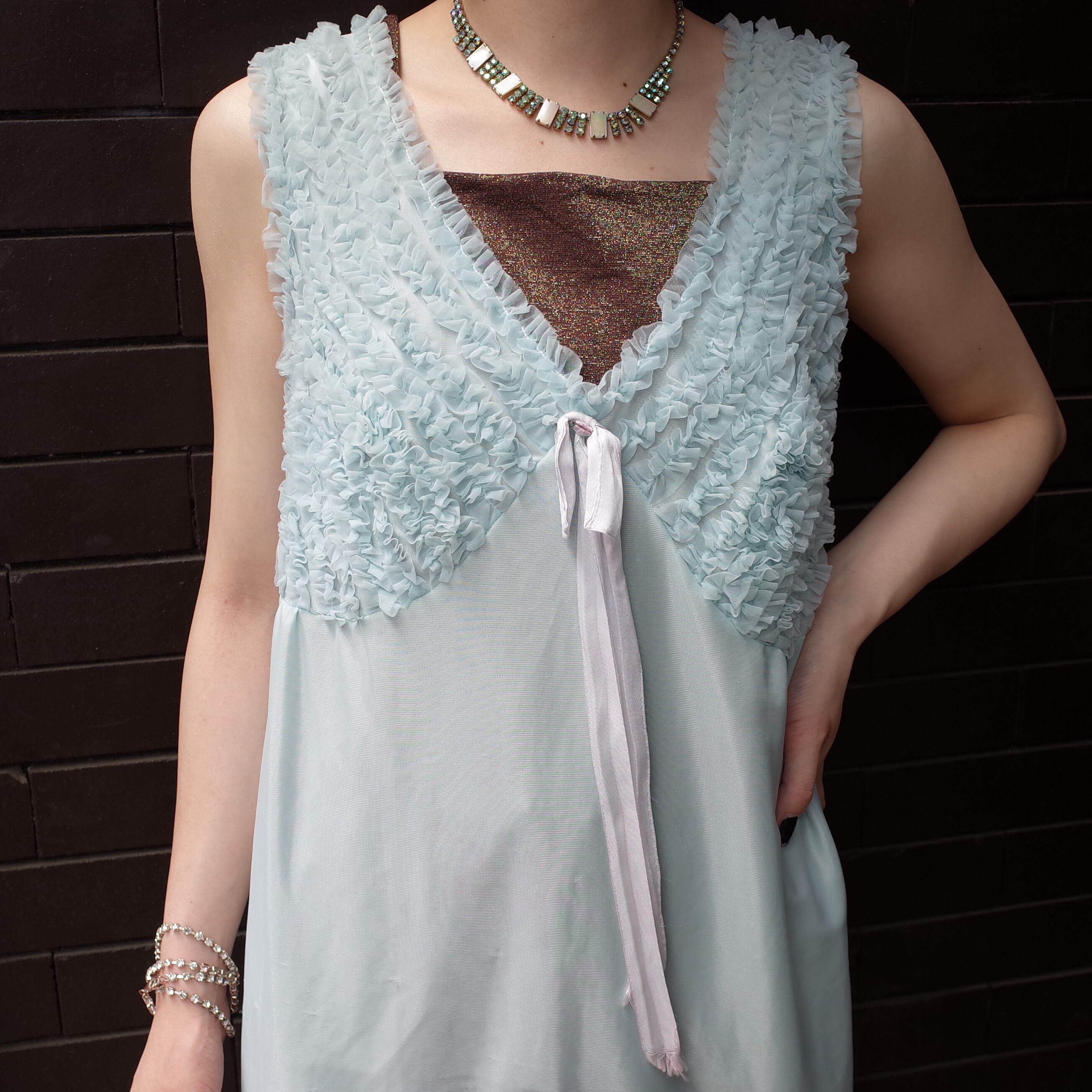 こちらの商品は品質性質上全体的に伝線箇所があり、裾部分にうっすらとピンク色の汚れ、リボンにほつれがございます。