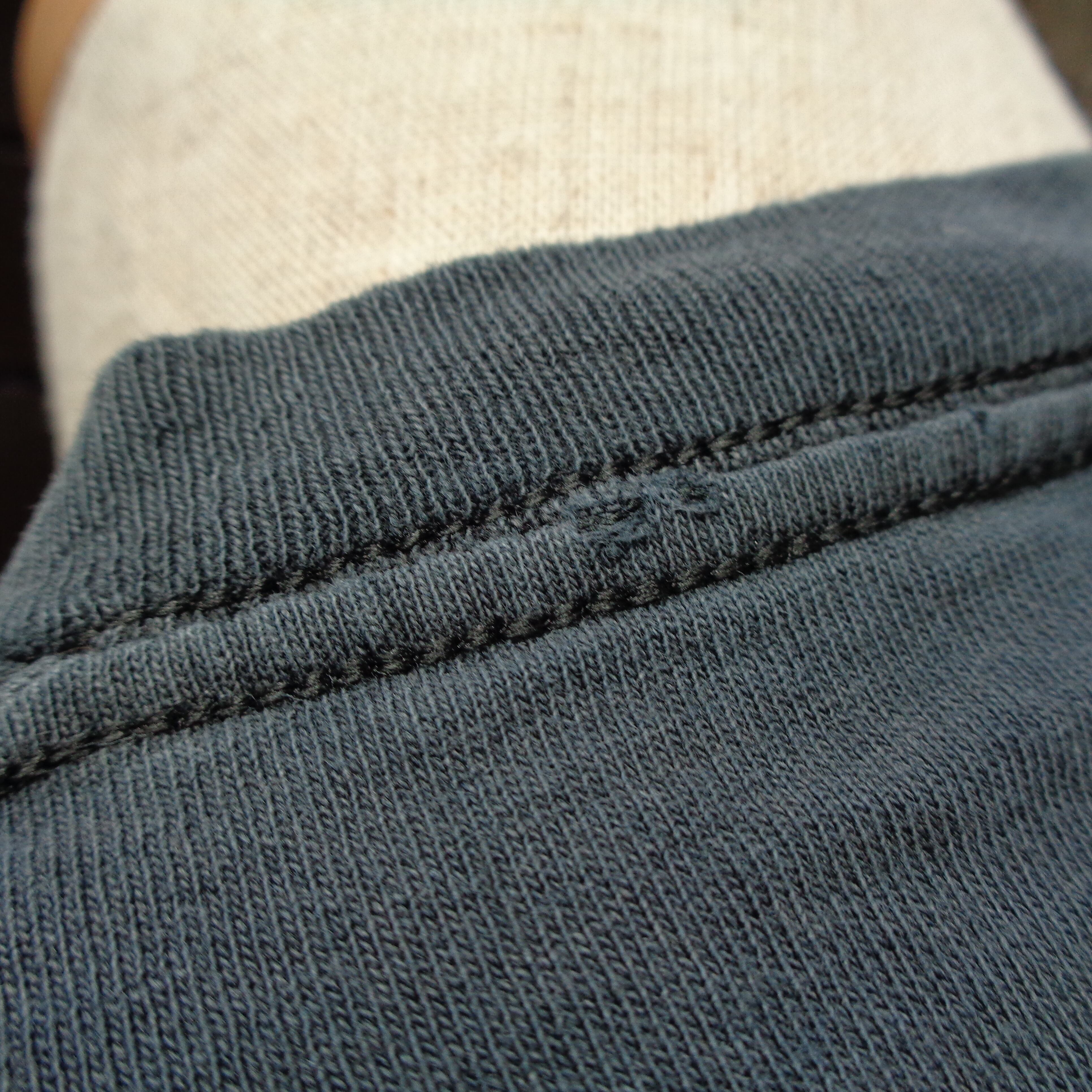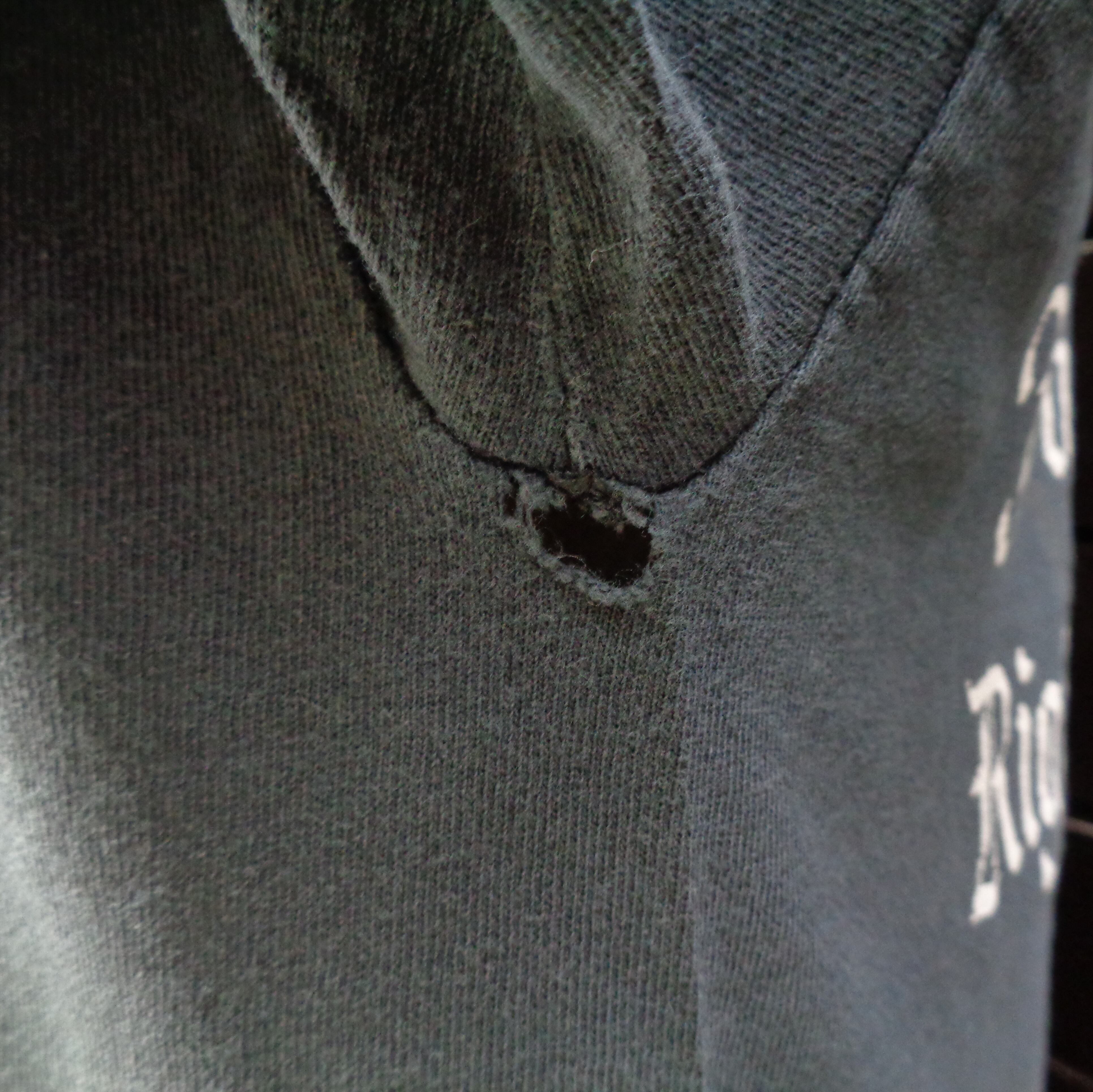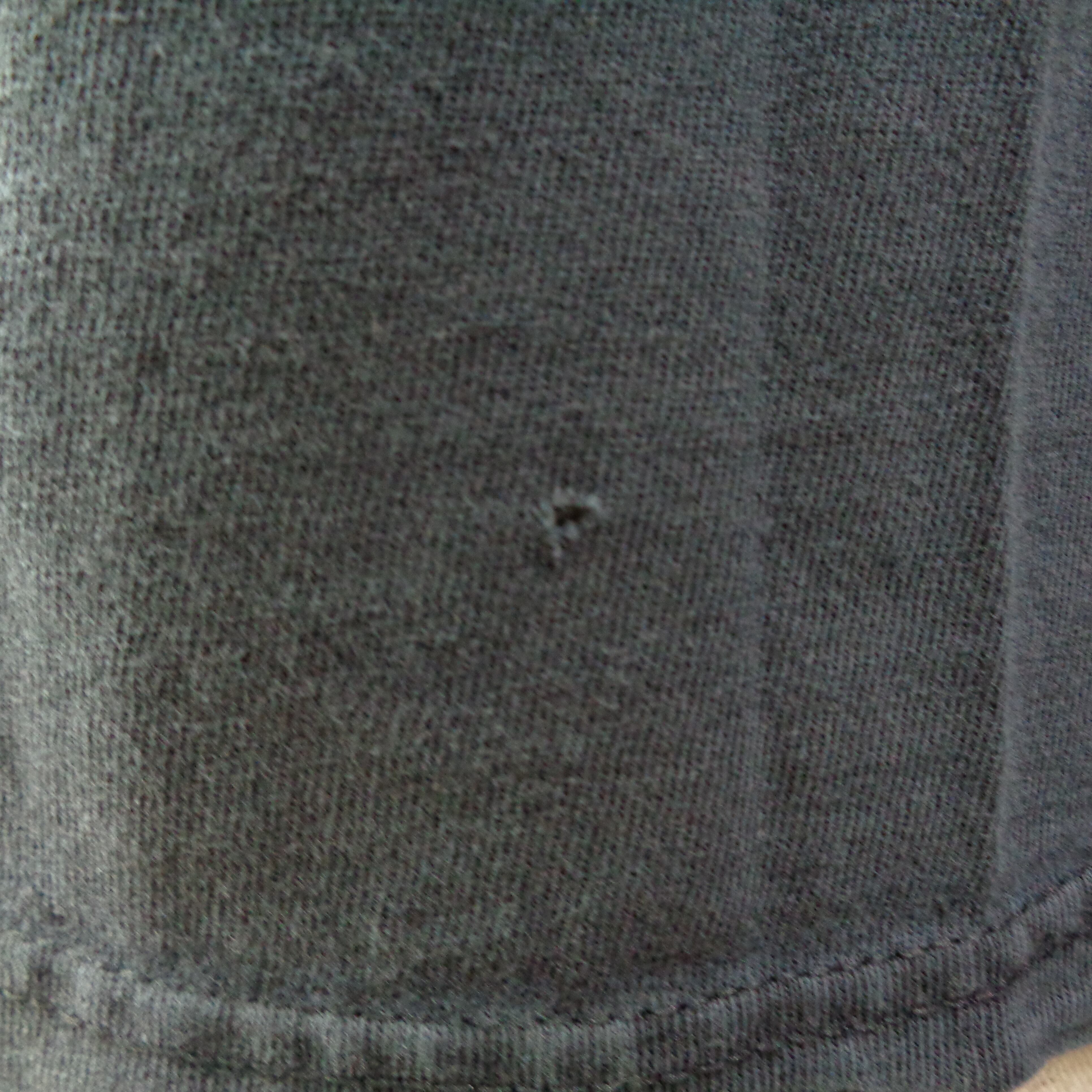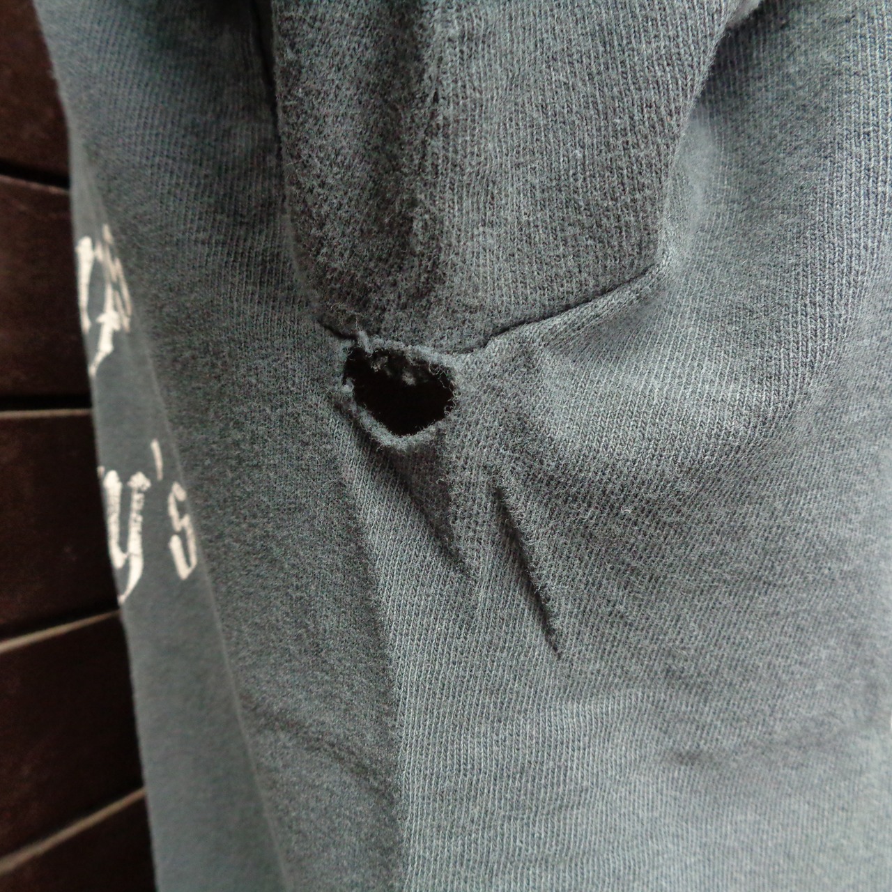 こちらの商品は、両脇下に穴、首元にダメージ、前身頃、後身頃に小穴、全体的な着用感と色褪せがございます。
