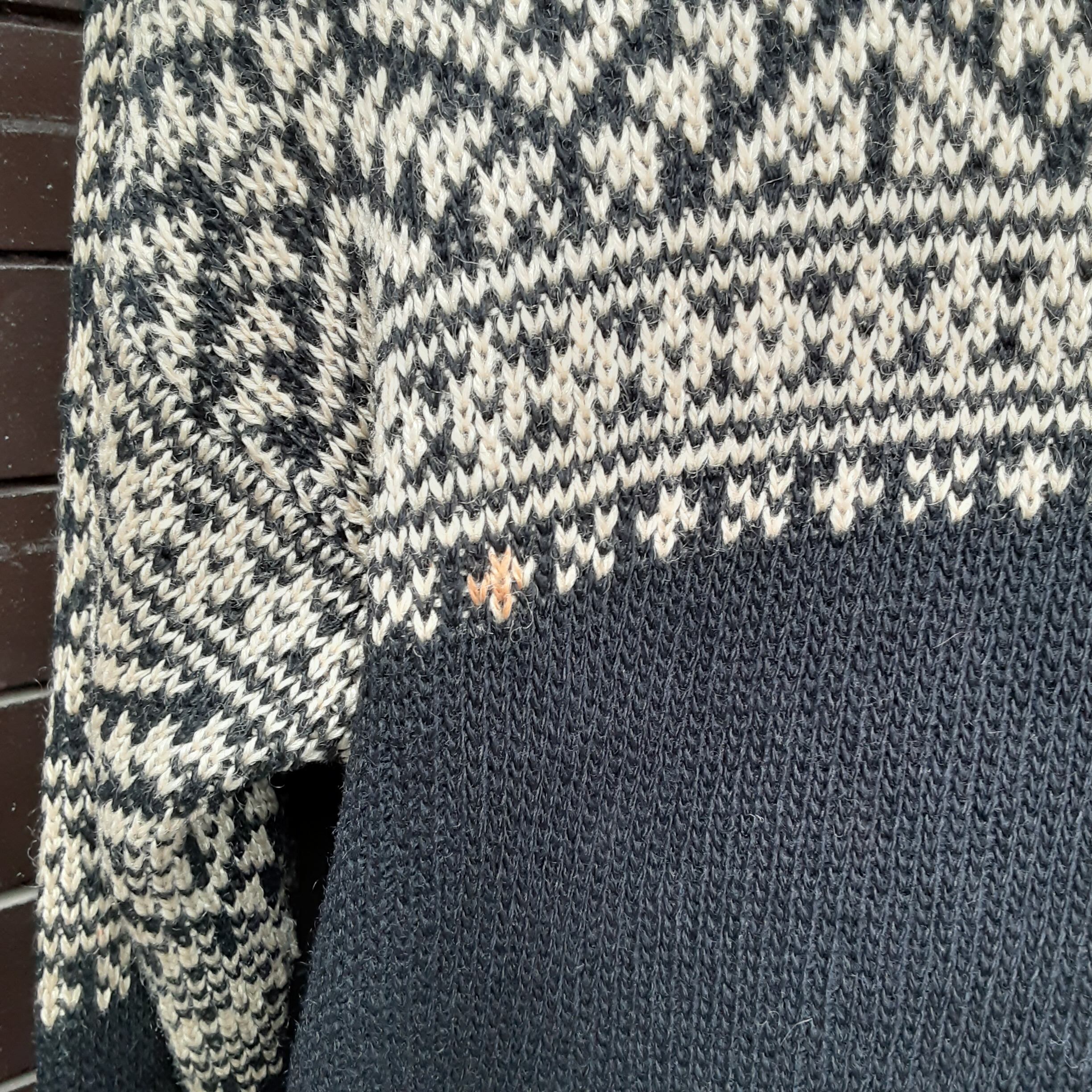 こちらの商品は、前、後ろ身頃に汚れ、右袖にほつれがございます。