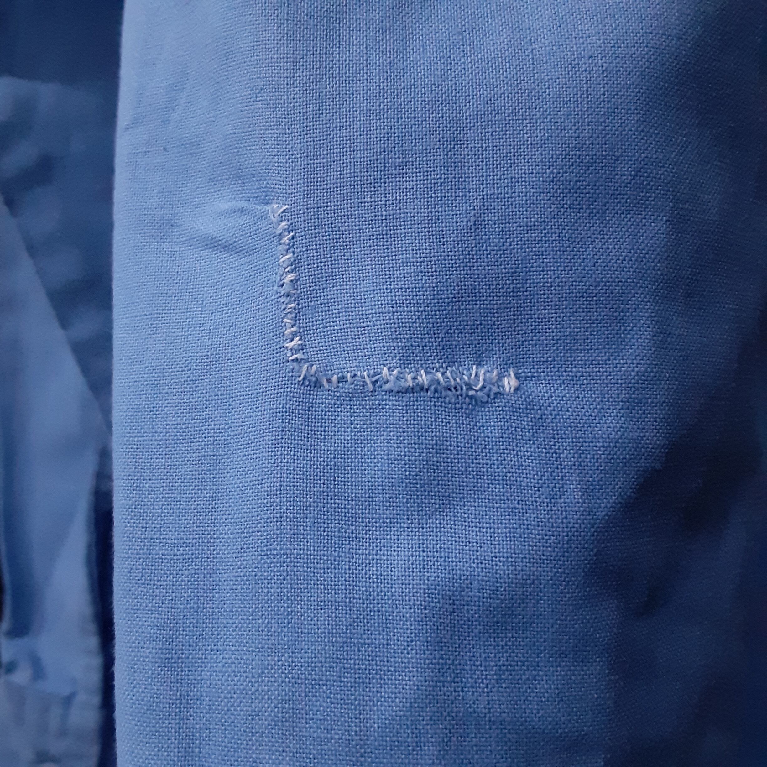 こちらの商品は、右肩、右袖にシミ、前身頃に非常に薄い日焼け跡のような物、後ろ身頃にリペア跡がございます。