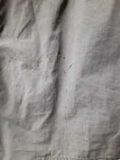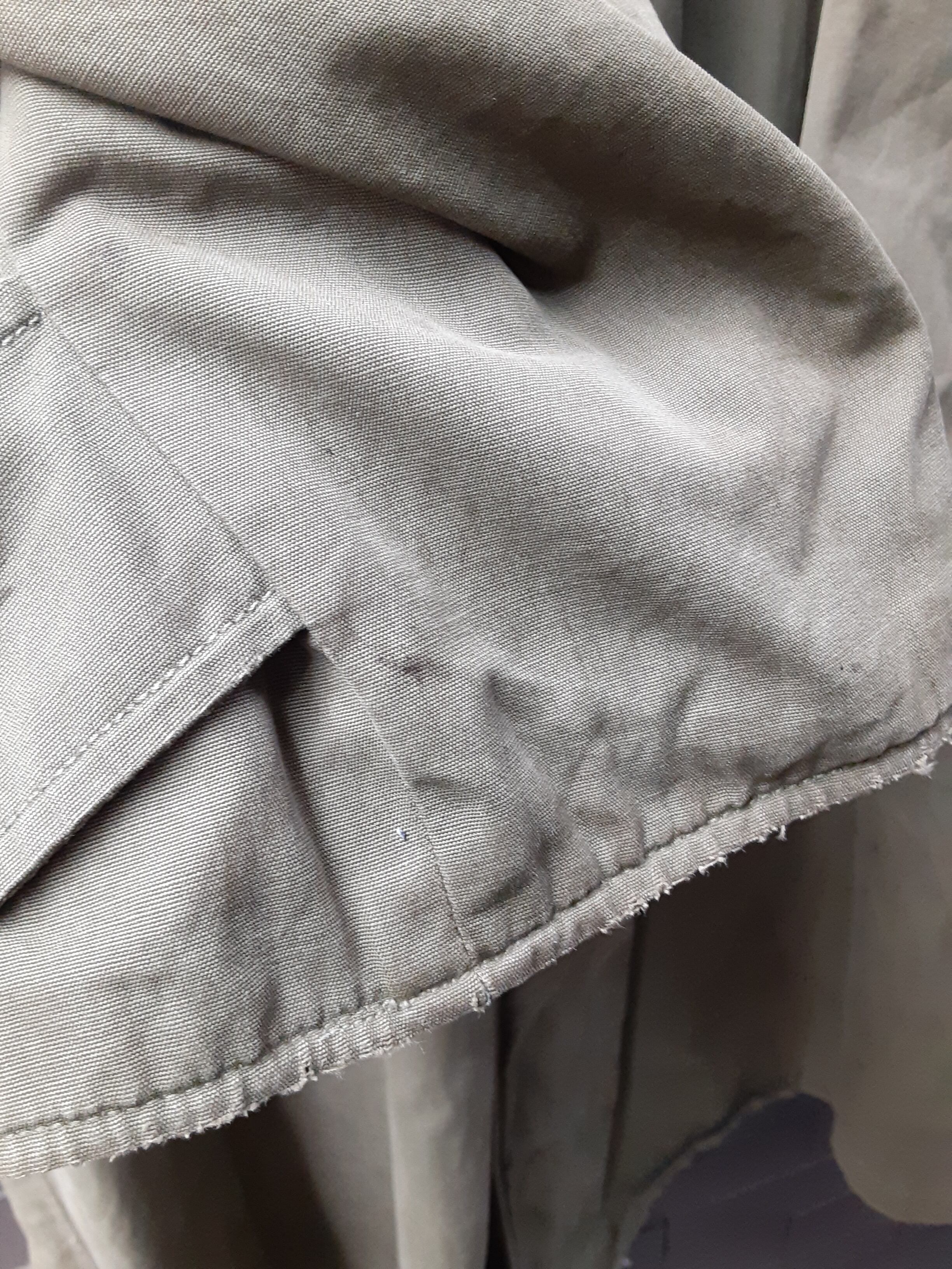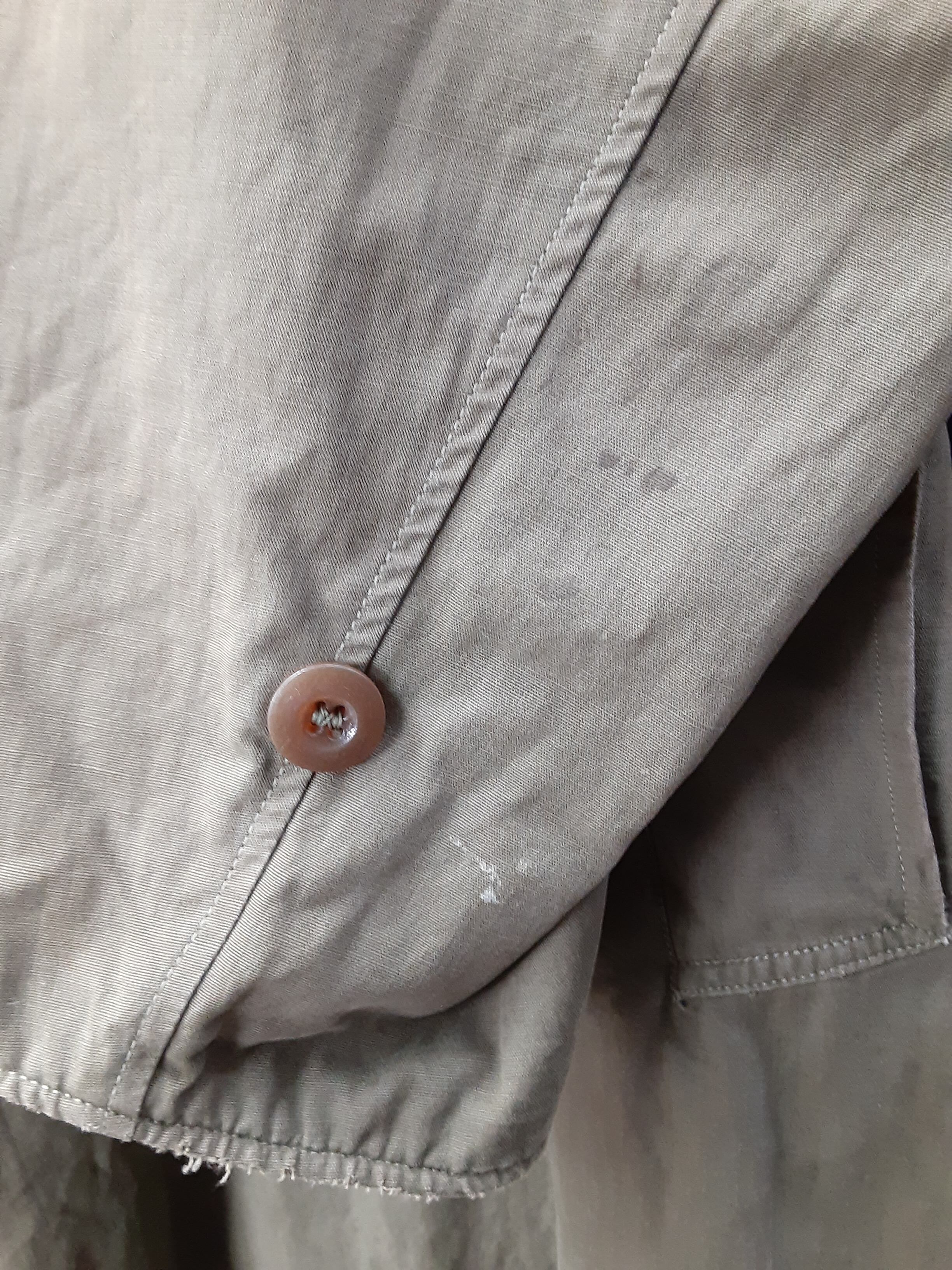 こちらの商品は、全体的に汚れ、ダメージがございます。また、ウエストベルトが欠損しており、第一ボタンが付け替えられています。